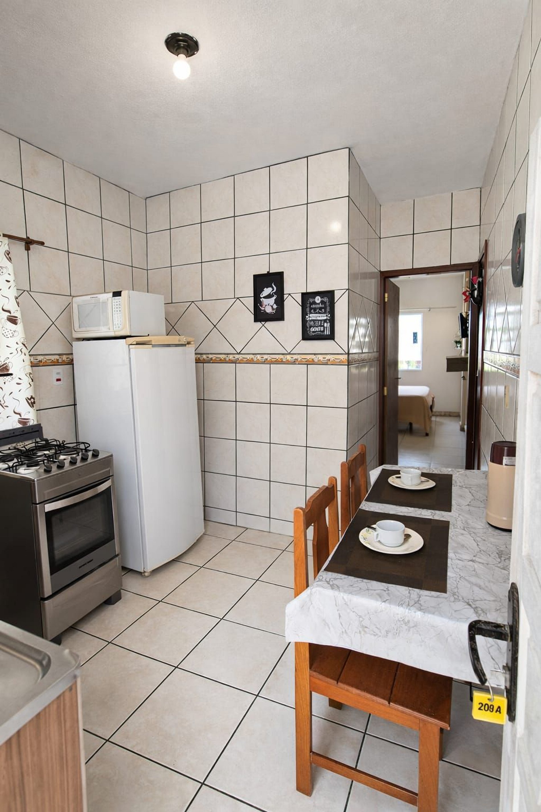 cozinha equipada com fogão, geladeira, micro-ondas e utensílios